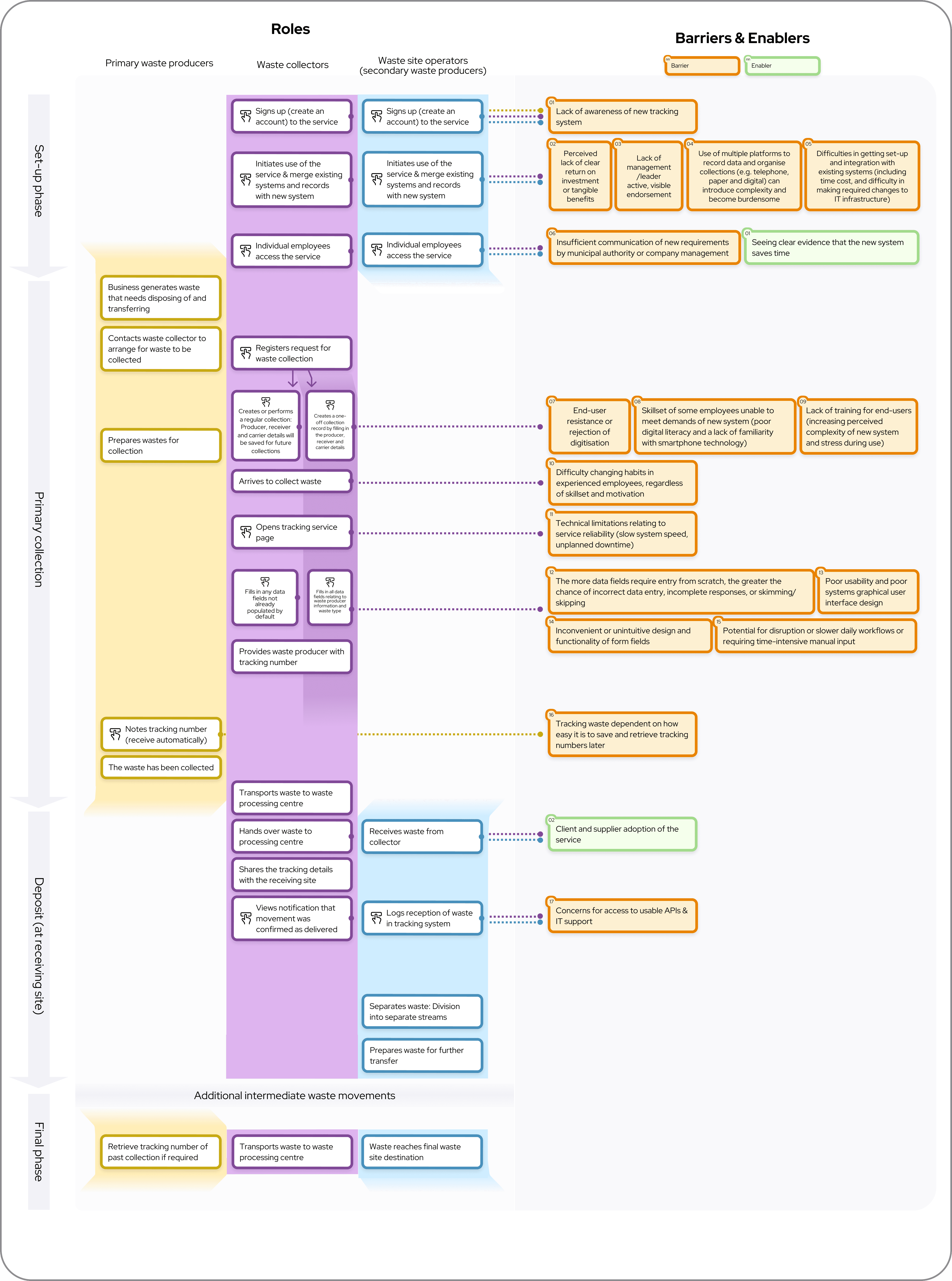 The project was split into two workstreams. The second looked at understanding the behavioural barriers and enablers of users in relation to a new digital service, and here I developed a behavioural map looking at the use of the new digital service across three different users and the associated barriers and enablers for each action. This asset has provided the policy team with an asset that offers them behavioural insight across specific points of interaction with the new digital service, allowing them to consider how to address the challenges raised.